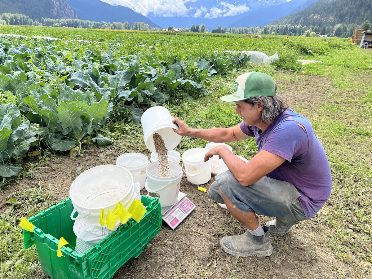 Andrew Budgell with Laughing Crow Organics portioning seed for their trial on interseeding cover crops with broccoli. Credit: E.S. Cropconsult.